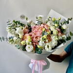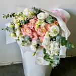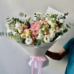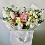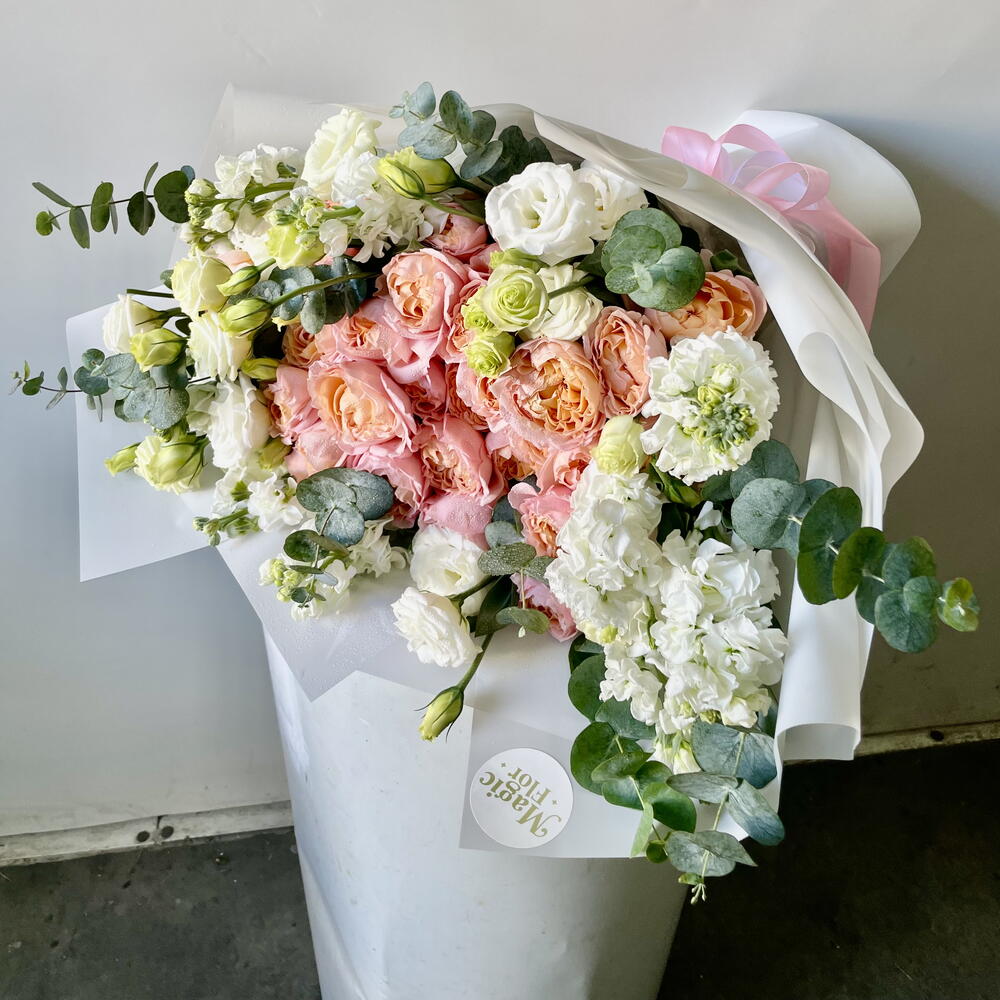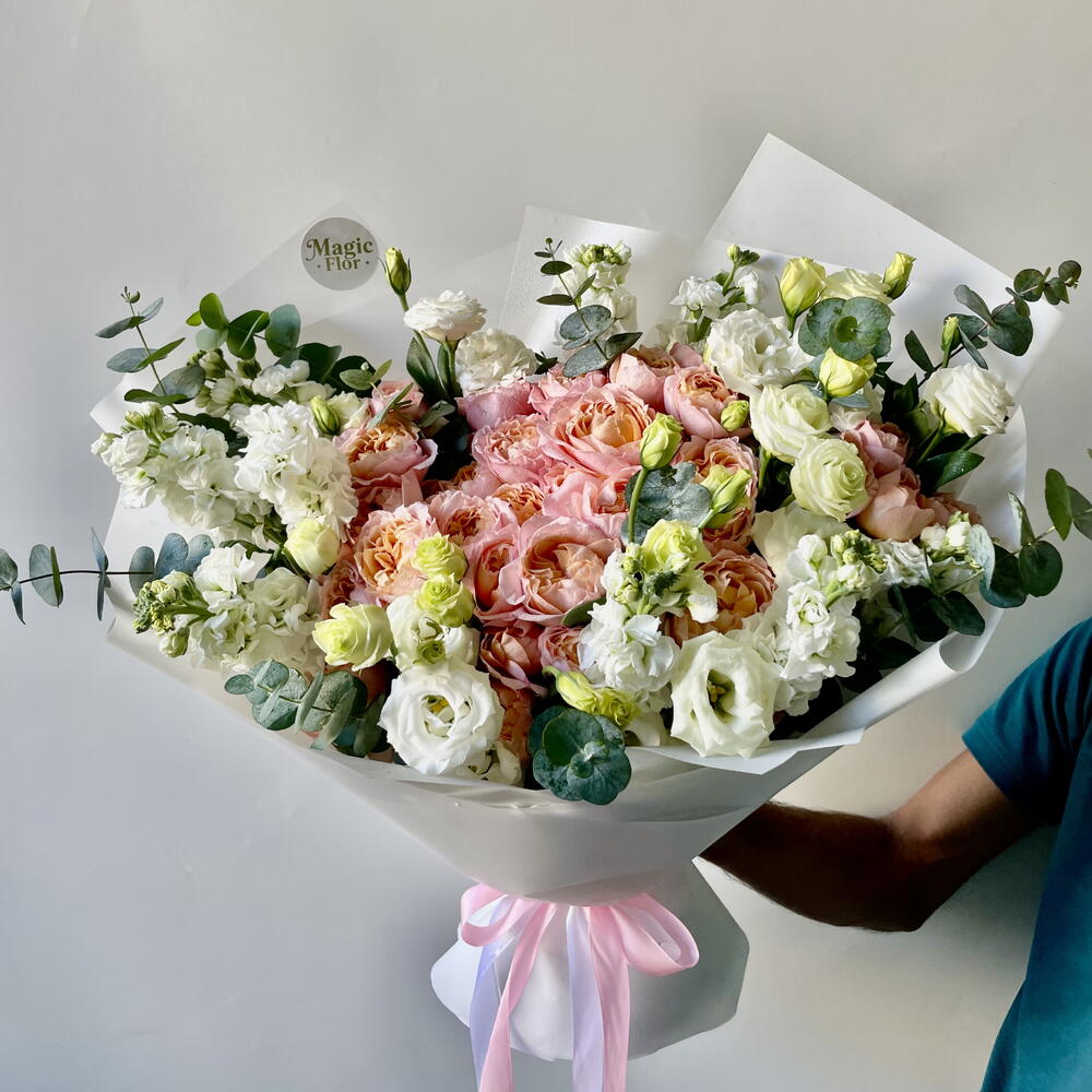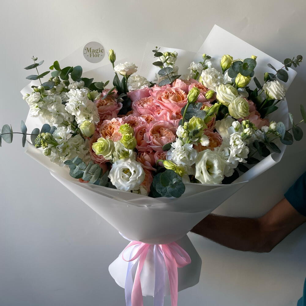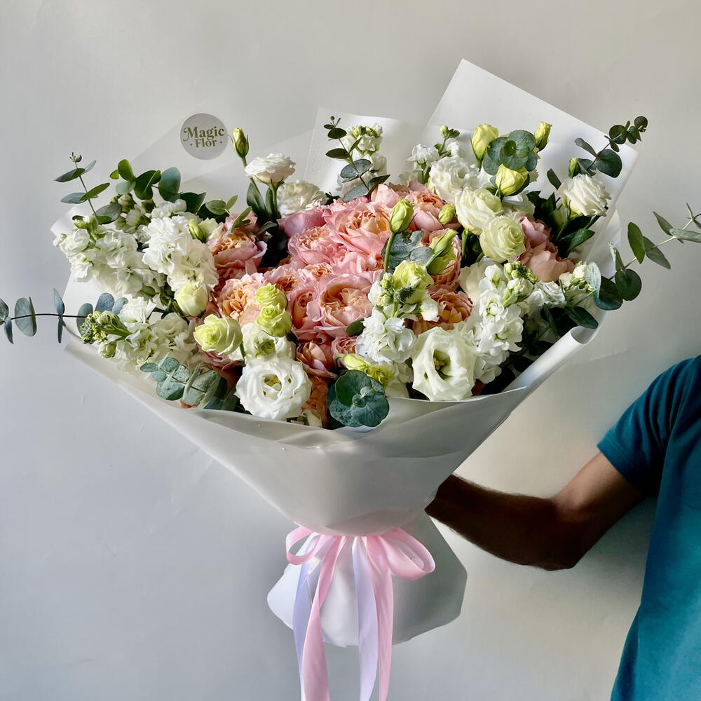 Побалуйте себя изысканной элегантностью нашего букета «Флористский спецпредложение», состоящего из 10 кустиков розы Джулиата, распустившихся в прекрасном теплом пастельном оттенке. В дополнение к ним вы найдете 7 безупречных, чистых белых цветков эустомы, добавляющих успокаивающий штрих к этой цветочной симфонии. Подчеркните страстную эстетику 9 точечными цветками матиолы аметистового сияния. Букет дополнительно украшен 5 зелеными листьями эвкалипта, красиво ниспадающими среди остальных цветов. Сумочка, сопровождающая букет, элегантно скрывает его цветы; это интригующее сочетание. Эта уникальная комбинация цветов великолепно передает разнообразие текстур, цветов и природной красоты, что делает ее идеальным подарком для любого случая.