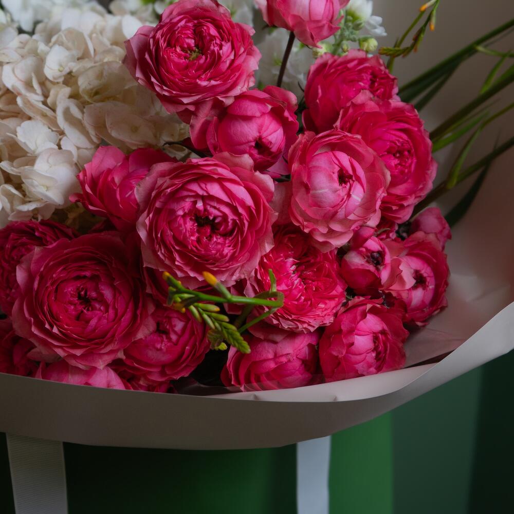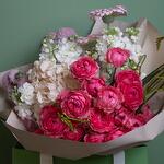 Hydrangea - 1 шт. Chrysanthemum - 2 шт. Gerbera - 3 шт. wrapping paper - 5 шт. julietta - 4 шт. маттиола спрей - 2 шт. роза прозрачная - 3 шт.