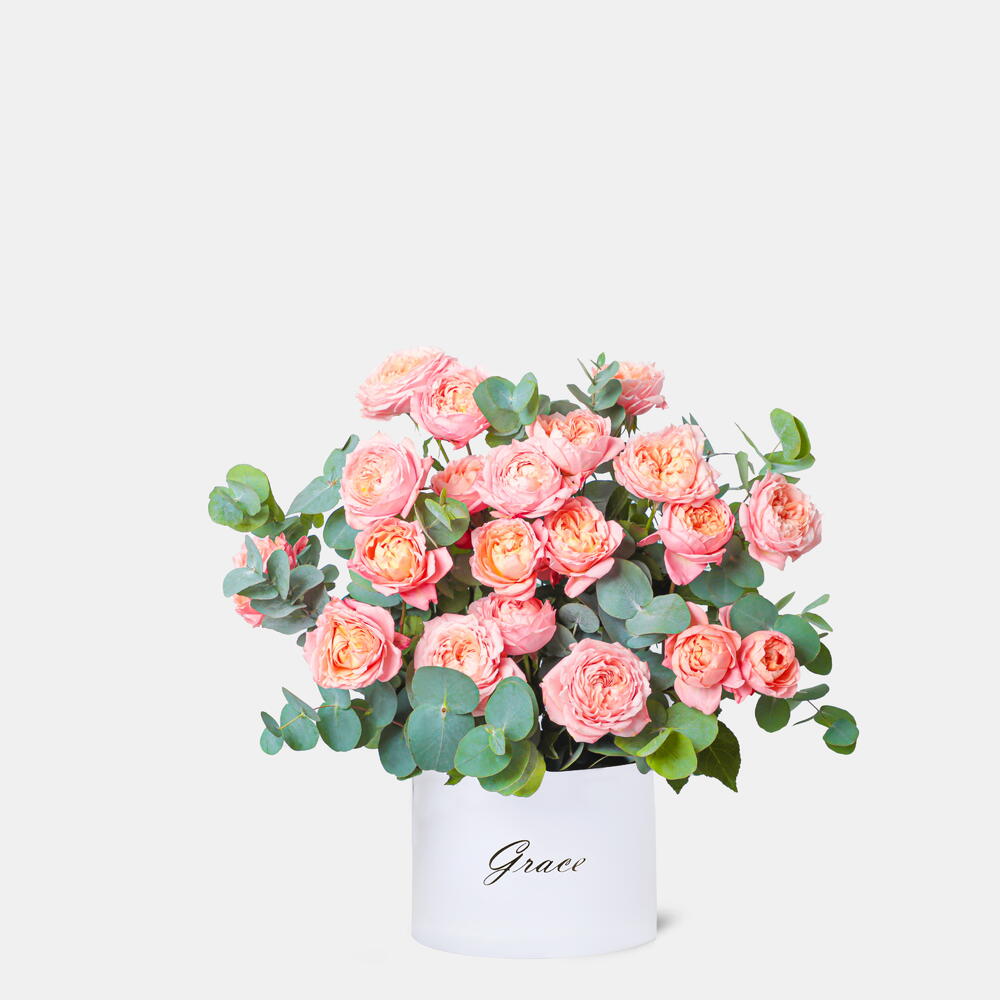 Juliet Peach in Box представлен элегантными персиковыми розами, прекрасно сочетающимися с эвкалиптом, создающими потрясающую и ароматную цветочную композицию.