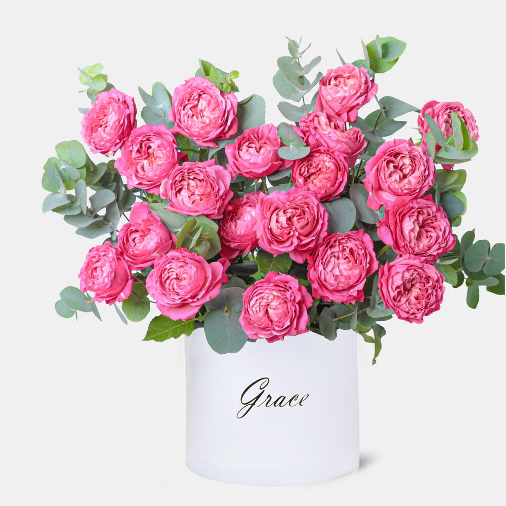 Розовая коробка «Джульетта», наполненная нежными розовыми розами и свежим эвкалиптом, излучает элегантность и очарование и идеально подходит для любого особого случая.