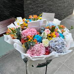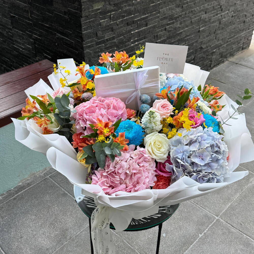 Погрузитесь в мир яркого волшебства с букетом Kaleidoscope Garden Bouquet. Этот великолепный, собранный вручную букет — настоящая феерия цвета, наполненная роскошным миксом премиальных цветов. Пышные розовые и нежные голубые гортензии создают завораживающую основу, которую прекрасно оттеняют изящные персиковые и кремовые розы, яркая оранжевая альстромерия и жизнерадостные жёлтые и синие акцентные цветы. Умело дополненный сочной зеленью, этот букет оформлен в элегантную белую упаковку и завершён ненавязчивой фирменной лентой. Внутри спрятана красиво упакованная подарочная коробка, добавляющая дополнительный штрих сюрприза и роскоши. Kaleidoscope Garden Bouquet создан, чтобы произвести незабываемое впечатление, даря радость и спектр красоты для любого случая.