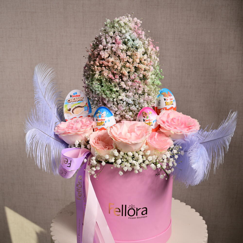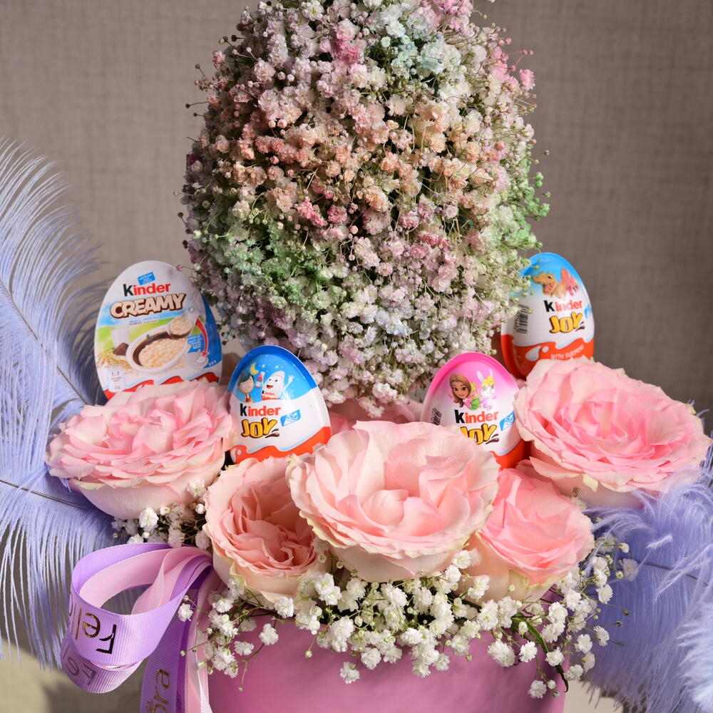 Эта восхитительная композиция включает нежно-розовые розы, пушистую гипсофилу и яркую гипсофилу пастельных оттенков, образующую форму пасхального яйца. В комплекте с четырьмя яйцами Kinder Joy это идеальный подарок на Пасху или любое торжество.