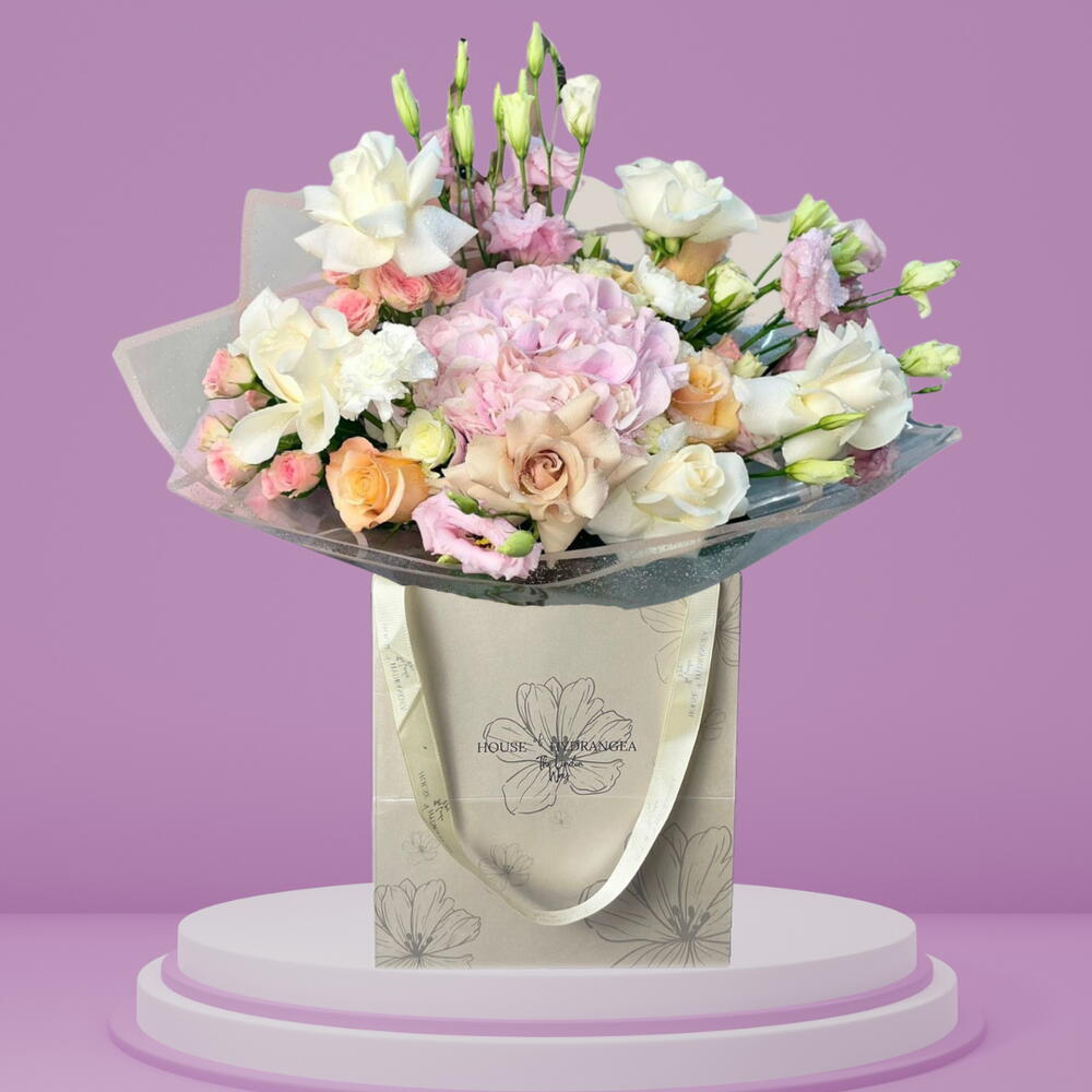 Наслаждайтесь изящным сочетанием сумки Floral Artists Special, состоящей из нежной красоты 1 изысканной гортензии, 5 очаровательных персиковых роз, 5 нежных роз-спрей розового цвета, 3 чарующих Lithiansus и 2 безупречных белых роз. Каждый стебель и лепесток тщательно отобран, чтобы создать завораживающую гармонию цвета и аромата — идеальный подарок, чтобы символизировать признательность, любовь или, дружбу.