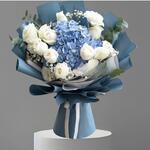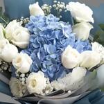 gypsophila white - 5 шт. blue hydrangea - 2 шт. eucalyptus leaves - 5 шт. white roses - 15 шт.