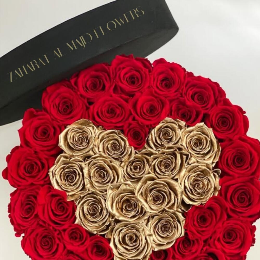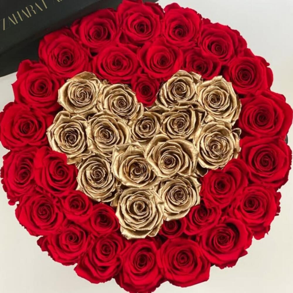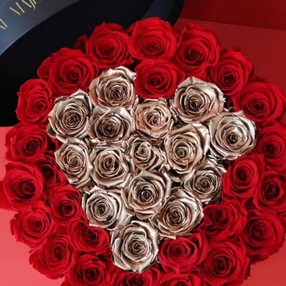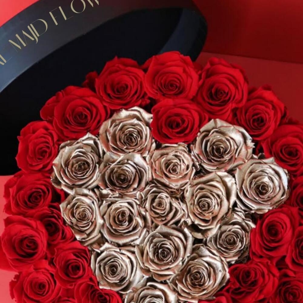 Красные розы — для любви. Золото — для наследия. Это Le Ronde — смелый, богатый, незабываемый. Majd Signature Edition Красные и золотые розы в круглой коробке Для моментов, которые заслуживают большего, чем обычное. Потому что роскошь — это не внешний вид. Это чувство.