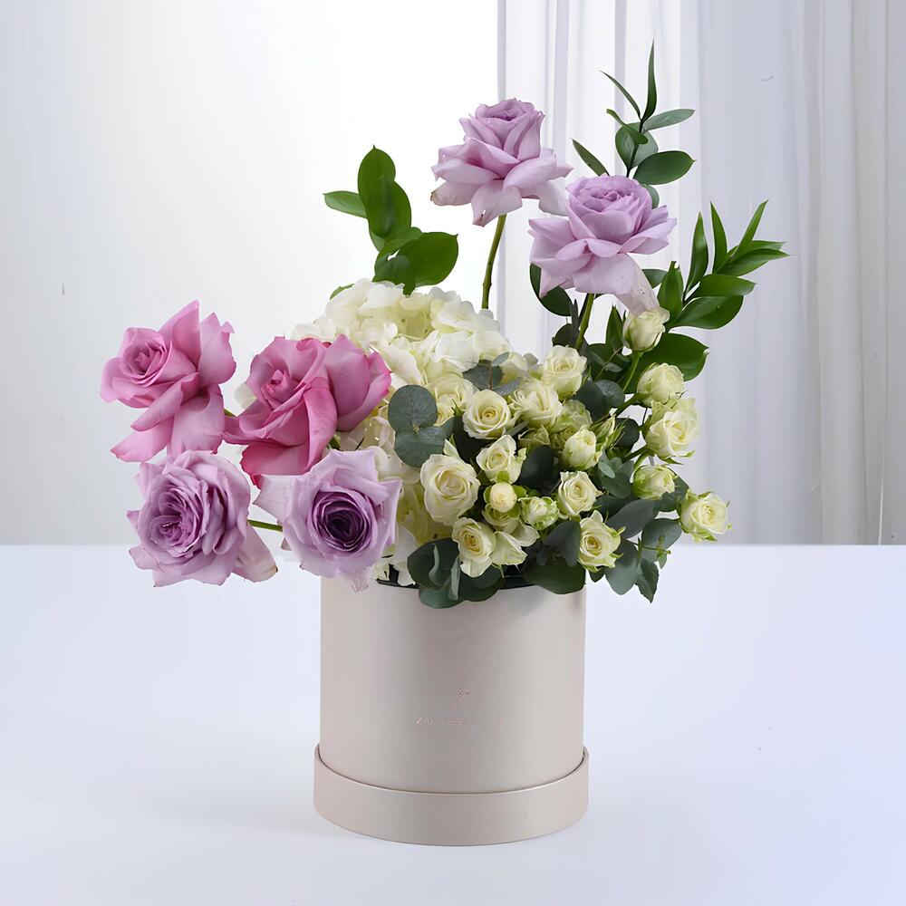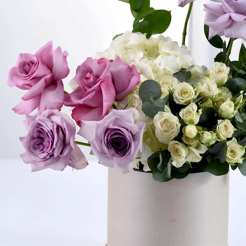 Нежная безмятежность нежных фиолетовых роз и белоснежных гортензий, подчеркнутая пышной зеленью, создает мечтательную и изысканную цветочную композицию.