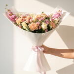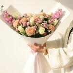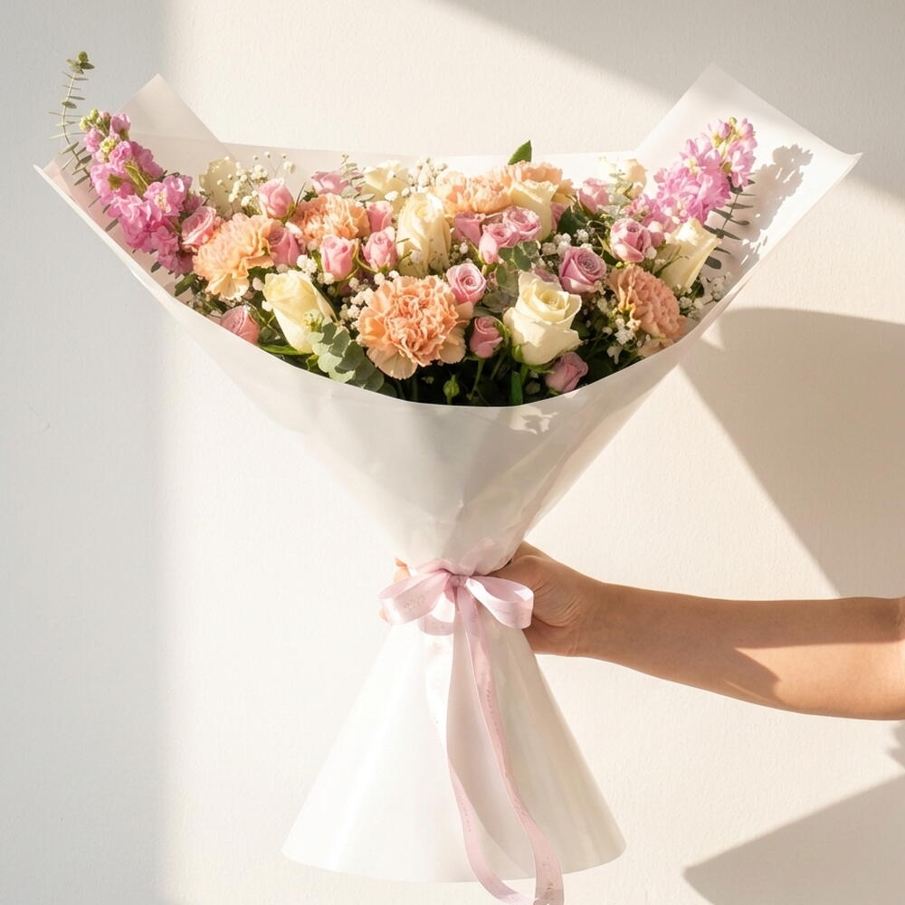 Букет «Лавандовая императрица» для Рамадана — это изящная цветочная композиция, призванная отразить безмятежность, достоинство и утонченную красоту в священный месяц Рамадан. Гармоничное сочетание белых роз, фиолетовых кустовых роз, персиковых гвоздик и нежно-розовой маттиолы создает ощущение спокойной элегантности и духовного тепла. Дополненный нежной гипсофилой, свежим рускусом и эвкалиптом, он обладает глубиной, текстурой и мягким натуральным ароматом. Завернутый в четыре слоя хрустящей белой бумаги и перевязанный мягкой фиолетовой лентой, этот букет идеально подходит для подарков на Рамадан, приглашений на ифтар, семейных встреч и чествования уважаемых старших. Его успокаивающая палитра лаванды и слоновой кости символизирует мир, размышление и сердечную благодарность, что делает его идеальным сезонным жестом.