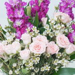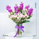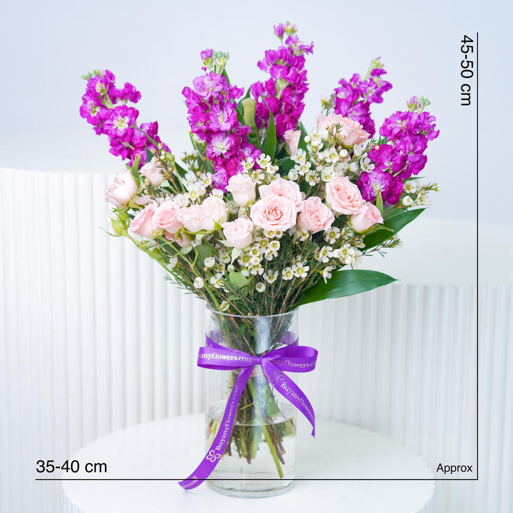 Побалуйте себя освежающей композицией цветов, тщательно подобранной нашим мастером-флористом. Эта особая композиция включает 5 ярких фиолетовых маттиол, добавляющих нотку элегантности и очарования. В сопровождении 4 нежных персиковых роз на изящных стеблях они наполняют аромат теплом и романтикой. Включение 3 воздушных белых восковых цветков усиливает изысканность, а 2 крепких стебля ямайской розы добавляют экзотический, тропический колорит. Эта цветочная мелодия дарит потрясающие визуальные впечатления и оживляет любое помещение своим великолепным сочетанием цветов и текстур. Она отражает мастерство и художественный вкус флориста, делая ее ярким украшением для любого случая.