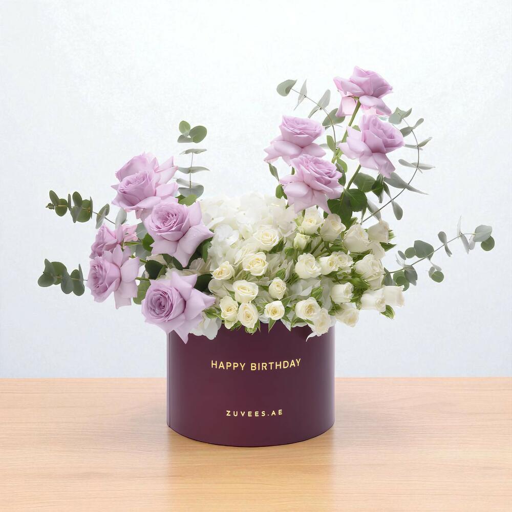 Почувствуйте вневременное очарование Lavender Light Happy Birthday Box, роскошной цветочной композиции, созданной, чтобы отмечать радость и особые моменты. Элегантно представленная в изысканной коробке, украшенной трогательной надписью Happy Birthday, эта композиция излучает счастье и умиротворение. Эта впечатляющая коробка доступна в двух элегантных вариантах: тёплого бежевого цвета и фирменного цвета Zuvees.