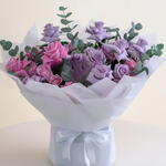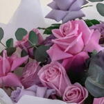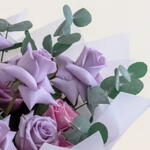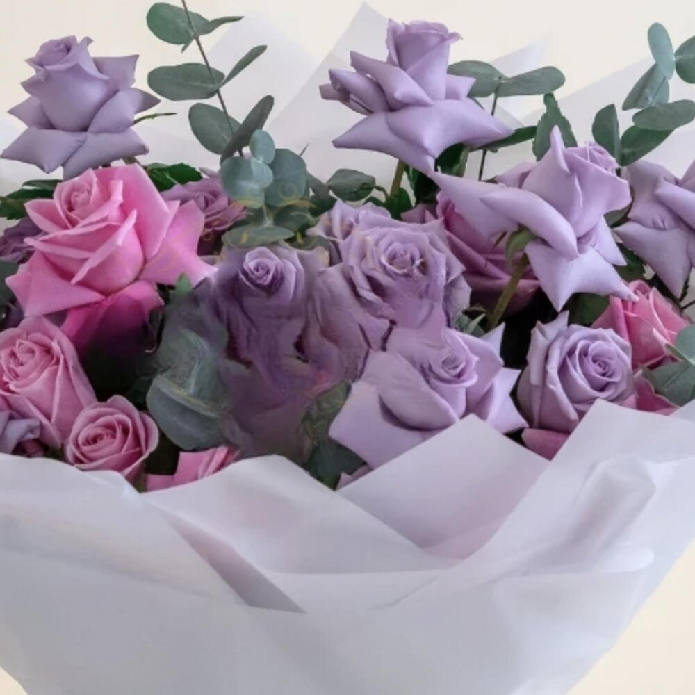 Это аранжировка — смешанный букет из розовых и фиолетовых роз, дополненный веточками зелени, вероятно листьями эвкалипта. Цветы собраны в округлой, классической форме и элегантно обёрнуты в белую или светлую бумагу, перевязаны подходящей лентой. Символика цветов предполагает сочетание чувств: Розовые розы обычно символизируют восхищение, благодарность, изящество и признательность. Фиолетовые розы часто символизируют очарование, королевское величие и любовь с первого взгляда. Листья эвкалипта придают свежий, натуральный штрих и могут символизировать мир и защиту. Общее оформление передаёт продуманное и романтичное послание, подходящее для различных случаев, таких как дни рождения, годовщины или как жест глубокой признательности.