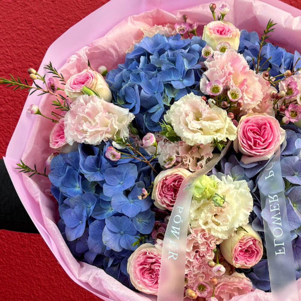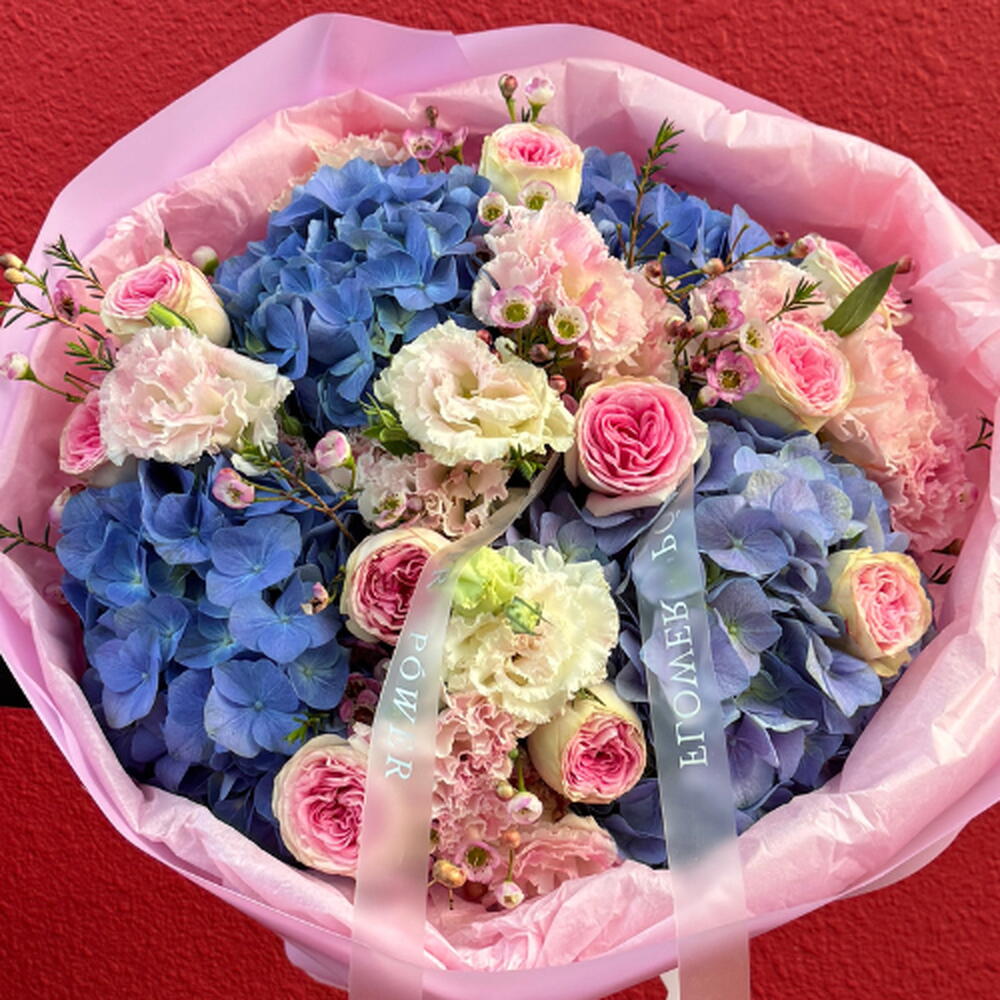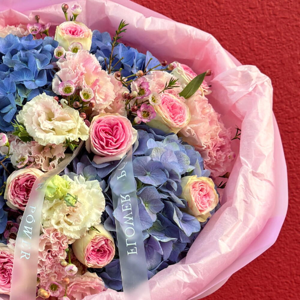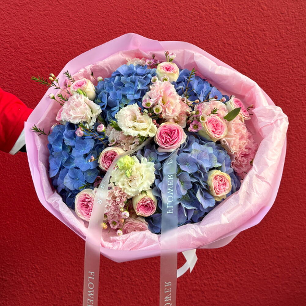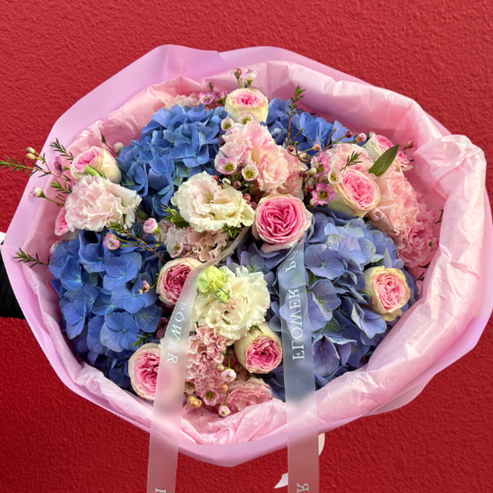 Поймайте волну цветочной элегантности с нашим букетом Lavender Wave. Потрясающая гармония морско-фиолетовых гортензий, бархатных роз и нежной светло-розовой эустомы — этот букет является высшим выражением грации и безмятежности. Идеален для роскошного подарка или романтического сюрприза.