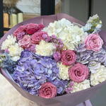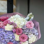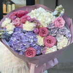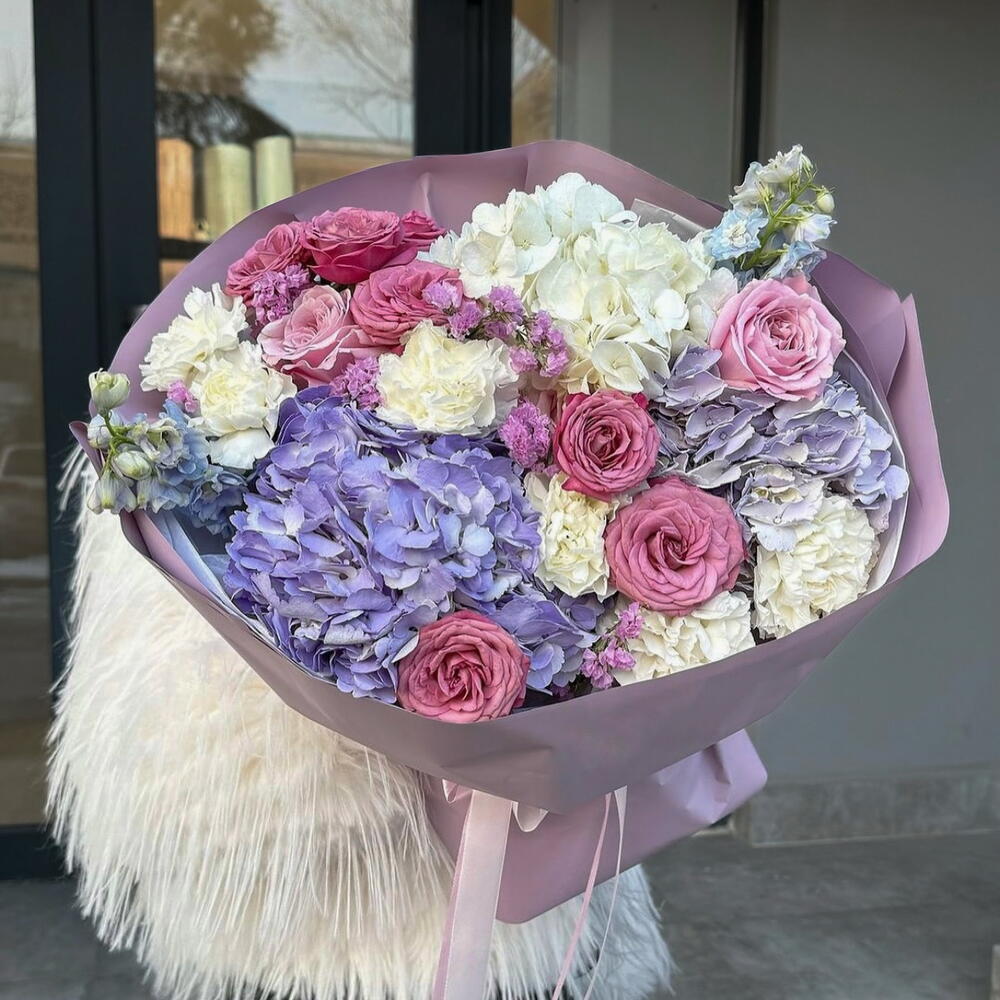 Мечтательное сочетание нежно-фиолетовых гортензий, розовых роз и кремово-белых цветов, оформленное в элегантных пастельных тонах. Букет «Лавандовый шепот» излучает грацию и умиротворение — идеально подходит для выражения любви, благодарности или искренних пожеланий.