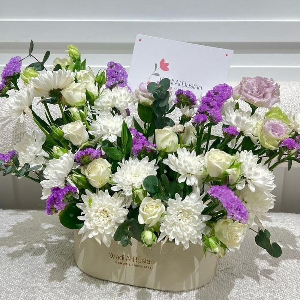 Этот очаровательный букет из нашей коллекции «Специальные предложения для флористов» отличается основательностью, элегантностью и успокаивающим спокойствием. В нем воплощено небесное величие 12 белых хризантем, создающих безупречный фон для нежного цветения 5 белых мини-роз. Ансамбль дополнен 10 веточками яркой фиолетовой статицы и 10 стеблями успокаивающего эвкалипта, придающими композиции земную свежесть. Композицию венчает романтика 10 фиолетовых или розовых роз, добавляющих нотку королевской роскоши. Этот потрясающий букет, являющийся настоящим визуальным наслаждением, обещает вечную красоту.