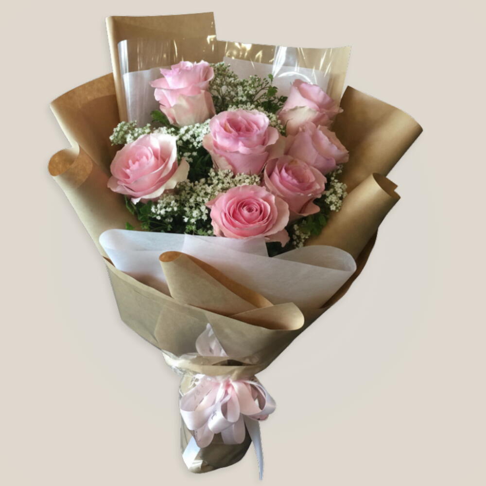 10 стеблей розовых роз, 4 стебля гипсофилы