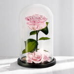Одиночная консервированная роза с длинным стеблем, деликатно заключённая в стеклянном куполе. Розы естественного происхождения, этично поставляемые из Эквадора, срезаны в расцвете и законсервированы в натуральных маслах. Они могут сохранять свою изысканную красоту как минимум в течение одного года и способны храниться до десяти лет (при надлежащем уходе). Розам не требуется вода, и их нельзя отличить от свежих аналогов.