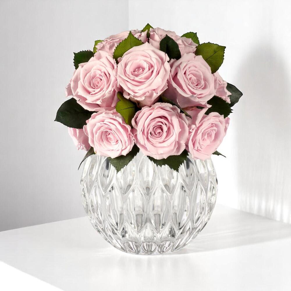 Представляем наш элегантный букет розовых роз – нежную и изящную композицию из красиво оформленных розовых роз, дополненную пышной зеленью. Этот букет, помещенный в шикарную кристально чистую вазу, излучает непреходящую красоту и элегантность. Нежный оттенок роз в сочетании с элегантным дизайном вазы делает эту композицию идеальным выбором для любого случая, от романтических жестов до торжеств. Она идеально подходит для придания нотки изысканности любому пространству, будь то дом или офис. Тщательно отобранные розы подчеркивают свою бархатистую текстуру и свежий, яркий аромат, гарантируя, что они станут центральным элементом композиции. Поистине очаровательный подарок, выражающий любовь, восхищение и элегантность. Стабилизированные розы в роскошной большой хрустальной вазе-аквариуме.
