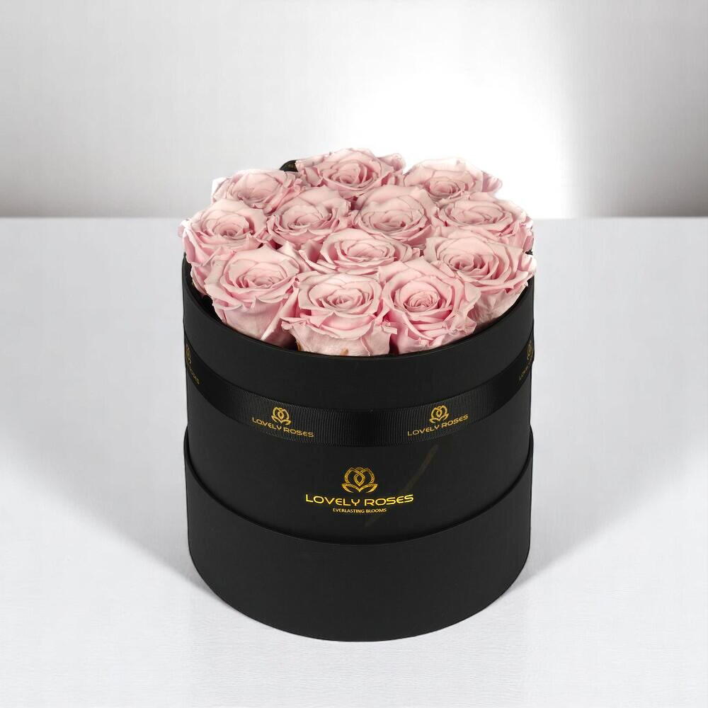 светло-розовая стабилизированная роза в круглой коробке 20 см - 12 шт.