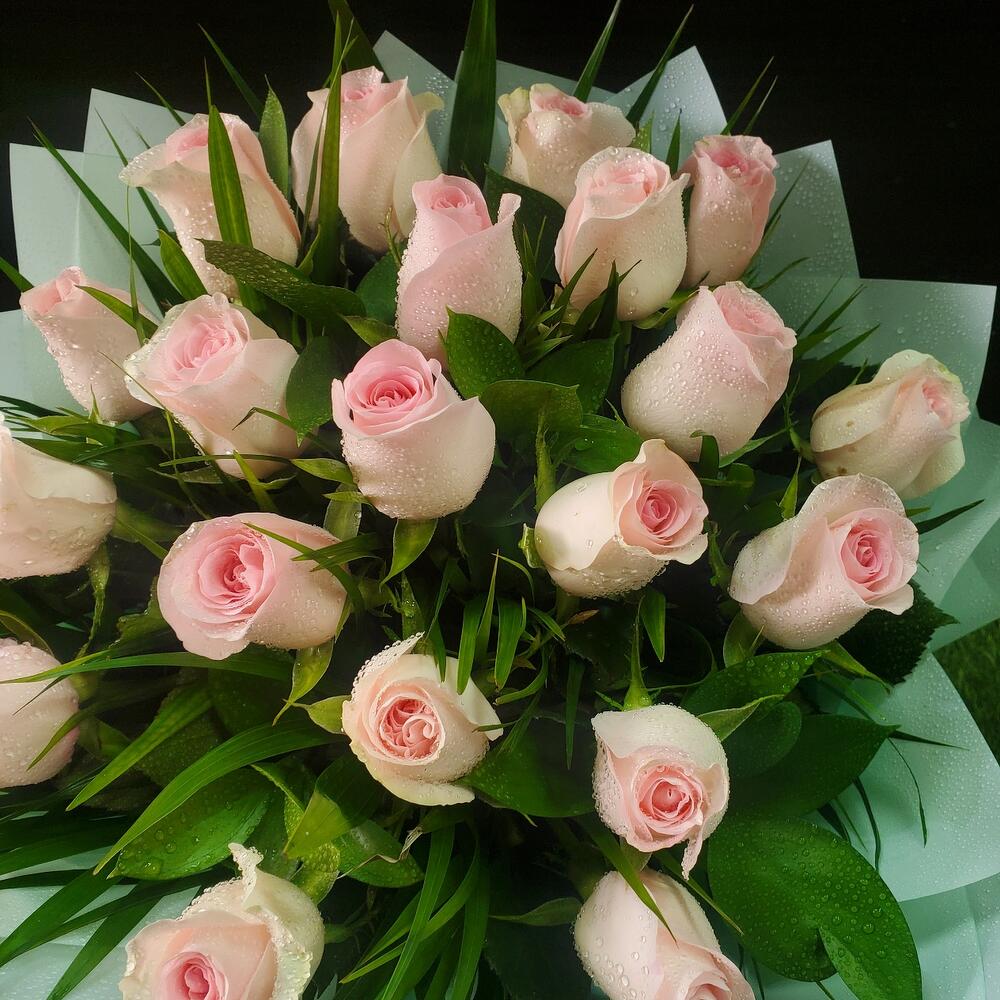 Ruscus - 9 шт. Pink rose - 20 шт. арека - 5 шт.