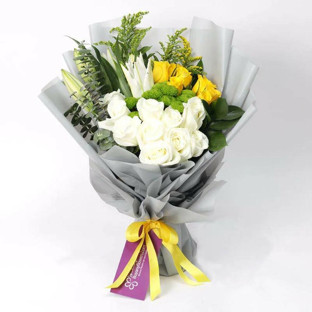 Информация о товаре: 10 белых роз 7 жёлтых роз 1 стебель белой восточной лилии 2 стебля зелёной пуговичной хризантемы 2 солидастера Листья: 3-5 простых рускусов и 2-3 эвкалипта Красиво упакованы в серую упаковку с бантом из ленты