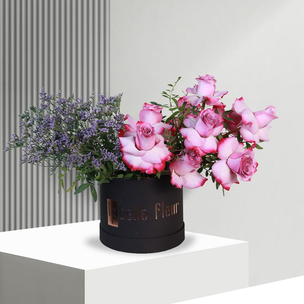 Eucalyptus - 1 шт. Limonium - 4 шт. rose - 14 шт. черная средная коробка bella - 1 шт.
