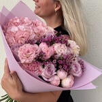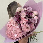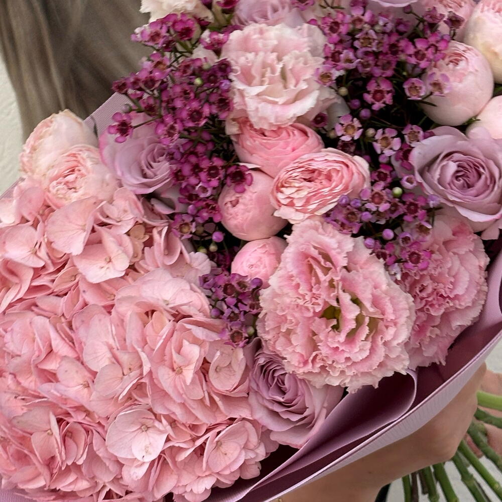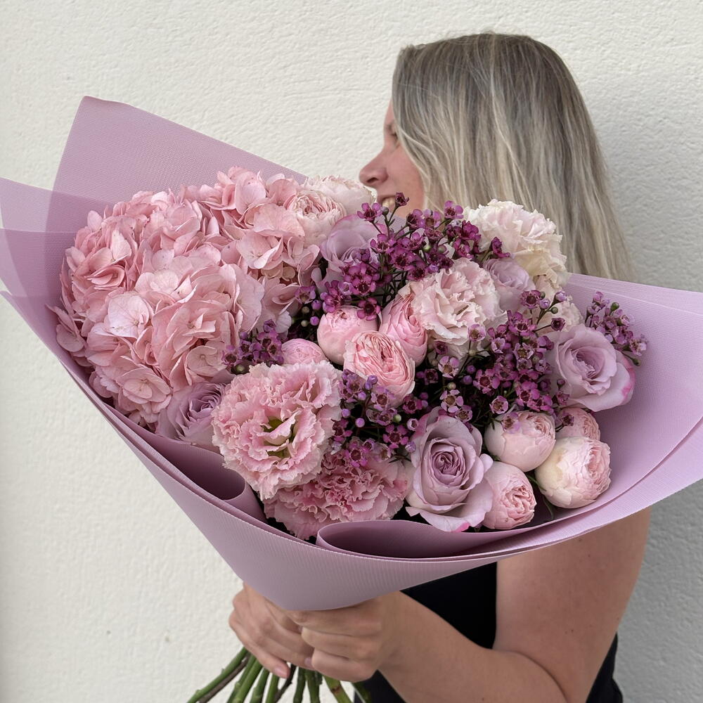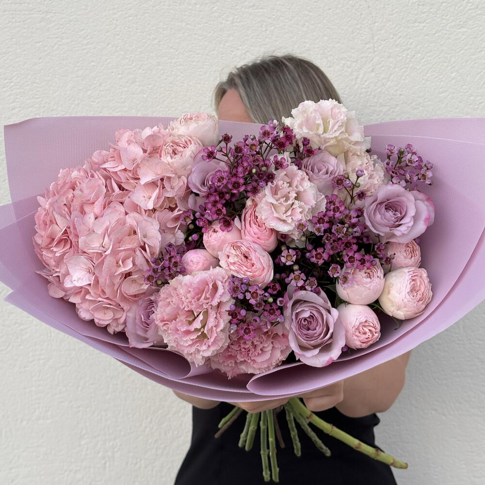 A luxurious and voluminous bouquet in soft blush and lilac tones, featuring lush pink hydrangea, delicate peony-style roses, classic lavender roses, fluffy carnations, and elegant waxflower accents. The composition feels rich yet airy, creating a refined and romantic statement. Handcrafted by a professional florist, this bouquet is designed with attention to texture, fullness, and natural flow. Only fresh premium flowers are used to ensure long-lasting beauty and an impressive visual impact. Perfect for birthdays, anniversaries, romantic gestures, gratitude, congratulations, or as a meaningful “just because” gift. This bouquet is ideal for women who appreciate soft luxury, elegance, and expressive floral design. Carefully wrapped in pastel lilac paper and delivered with care. A personalized greeting card can be added to complete the gift.