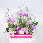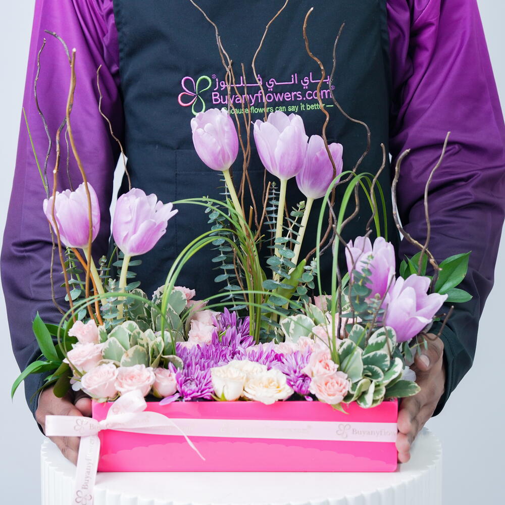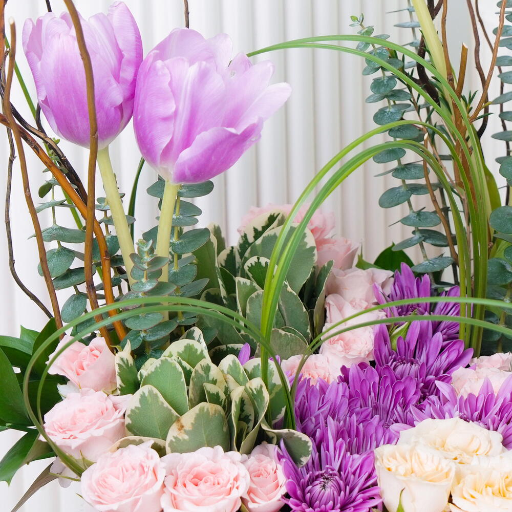 Ощутите очарование наших флористических спецпредложений с этой уникальной аранжировкой. Этот букет ручной работы включает семь очаровательных фиолетовых тюльпанов, красиво сочетающихся с одним стеблем нежных персиковых мини-роз. Две яркие ветви целозии добавляют всплеск цвета, в то время как ещё семь стеблей нежных розовых мини-роз и хризантем придают палитре мягкий румянец. Для завершения ансамбля три стебля освежающего питтоспорума, шесть стройных стеблей стальной травы и ещё шесть рускуса умело расположены в пышной композиции. Эта завораживающая смесь наверняка создаст незабываемую атмосферу, идеально подходящую для любого особого случая или просто чтобы скрасить ваш день.