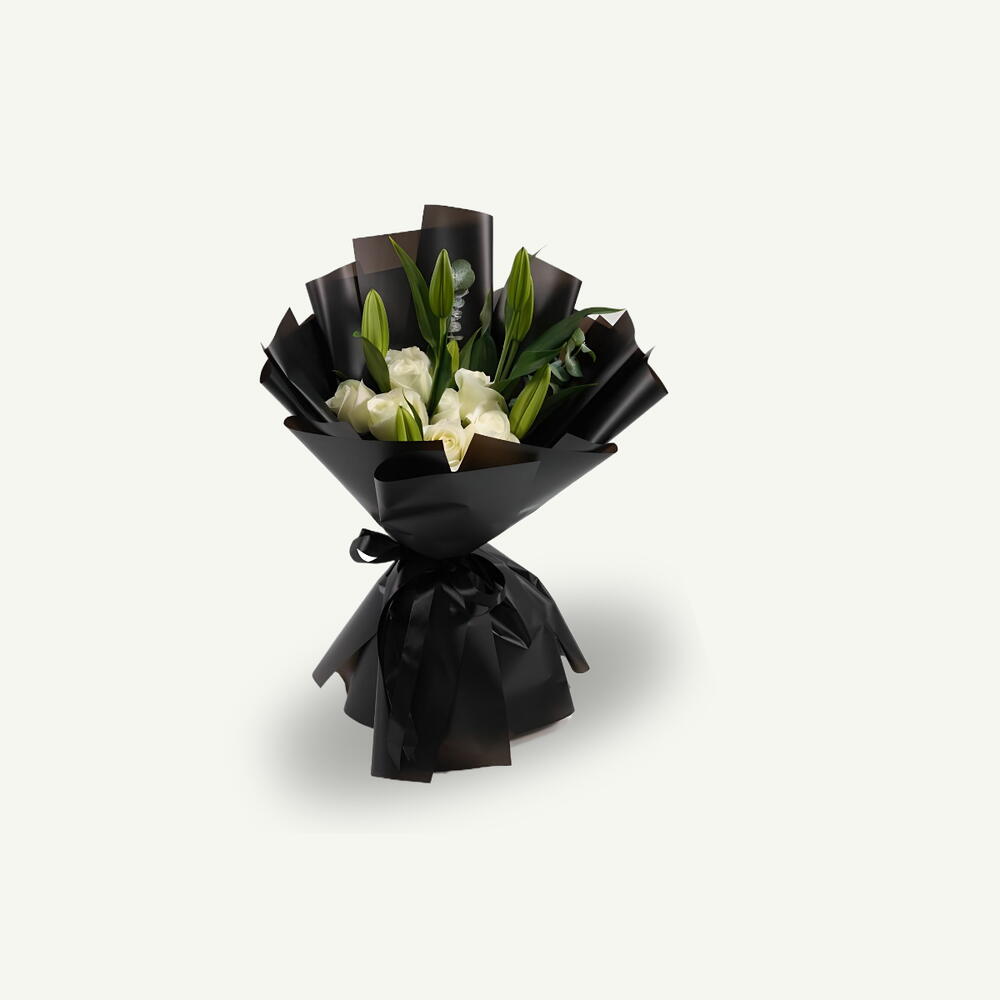 Букет, связанный вручную, из смеси от 6 до 9 свежих роз, лилий и эвкалипта, аккуратно оформленный в черную обертку для вневременной и элегантной презентации.
