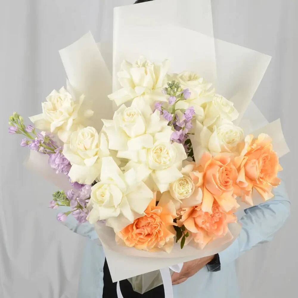 маттиола фиолетовая - 2 шт. персиковые розы - 5 шт. кремово-белая роза - 10 шт.