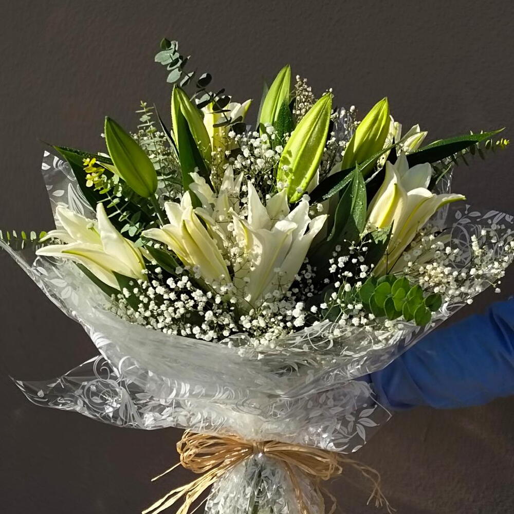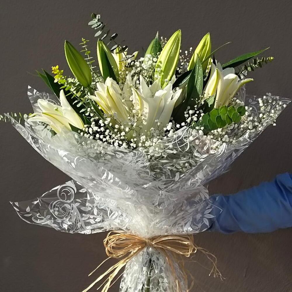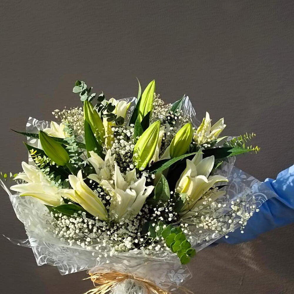 Букет из лилий; 5 веток белой лилии Откройте для себя непреходящую красоту и элегантность нашего монобукета. Этот букет, состоящий из 5 девственно белых лилий, символизирующих чистоту и утонченную красоту, прекрасно сочетается с 3 освежающими и ароматными ветками эвкалипта, которые создают атмосферу умиротворения, и 5 пучками нежных гипсофил, известных как гипсофила, символизирующая вечную любовь. Этот тщательно подобранный букет — идеальное сочетание красоты, изысканности и изящества — станет прекрасным выбором для любого случая. Позвольте его успокаивающему аромату передать ваши чувства близким.