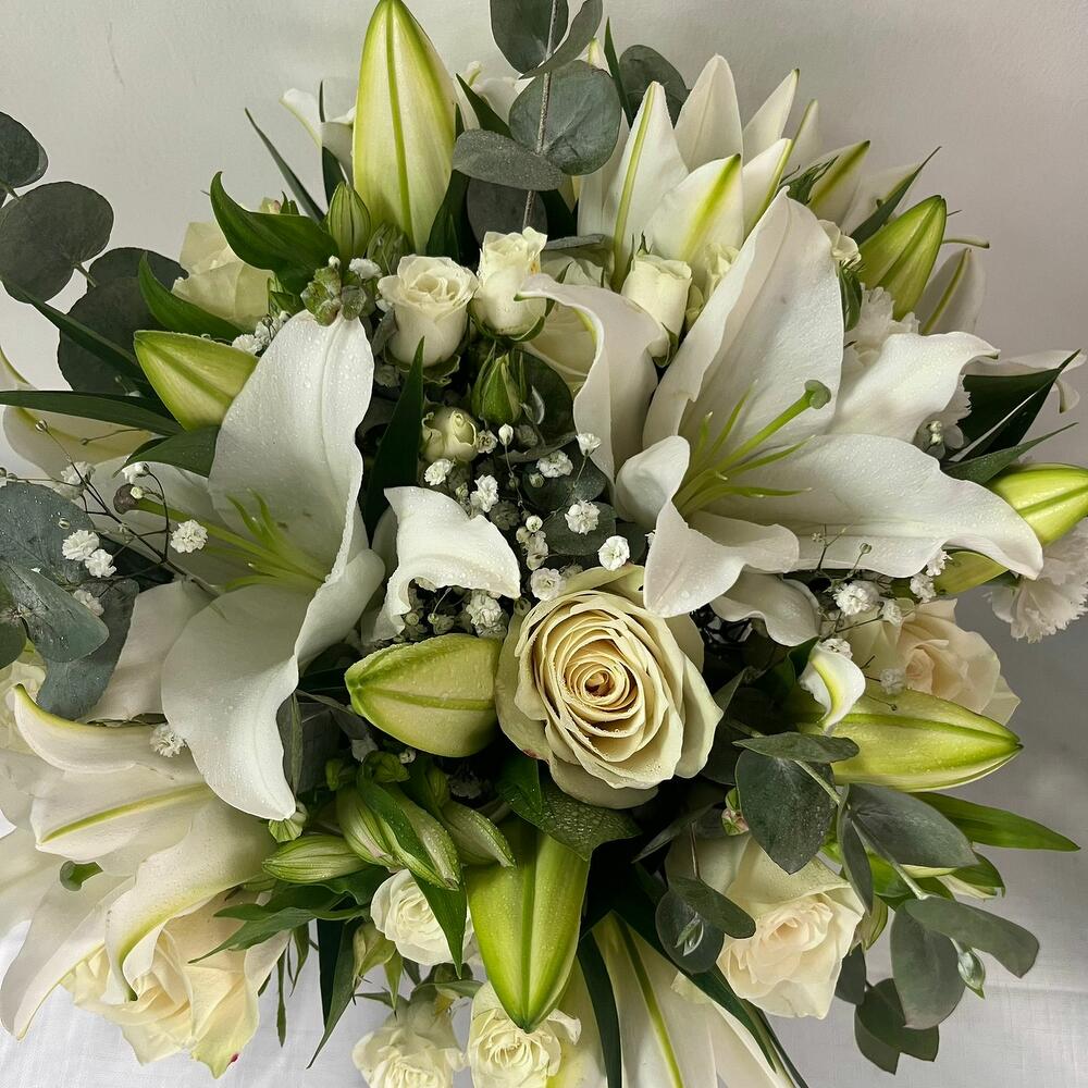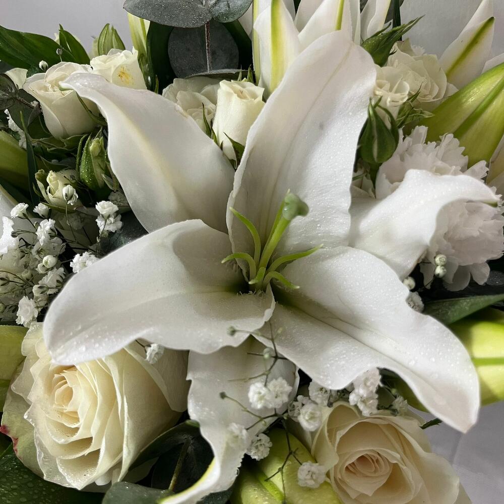 White rose - 10 шт. white alstroemeria - 3 шт. white spray rose - 3 шт. white lilly - 8 шт. eucalyptus leaves - 2 шт. белый гвоздика - 5 шт. гипсовая палочка - 2 шт.