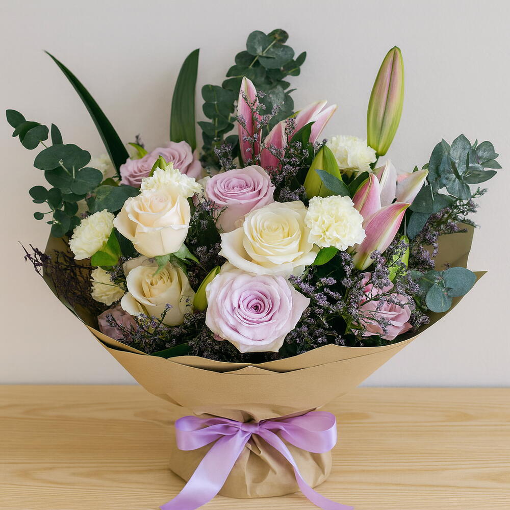 ЛИЛИЯ 2 РОЗЫ 10 ГВОЗДИКИ 5 СТАТИЦА 2 ЭВКАЛИПТ 2 В БУКЕТЕ 275 AED