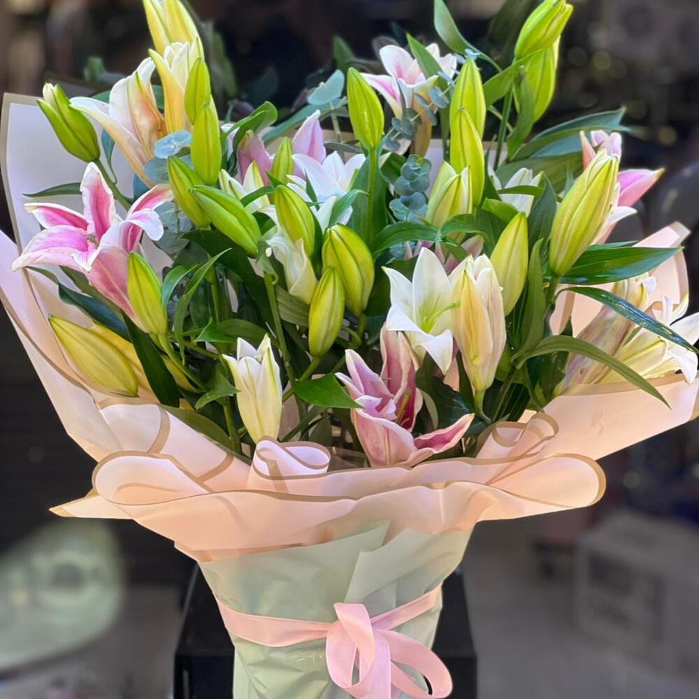 Eucalyptus - 3 шт. lily white - 5 шт. розовая лилия - 5 шт.