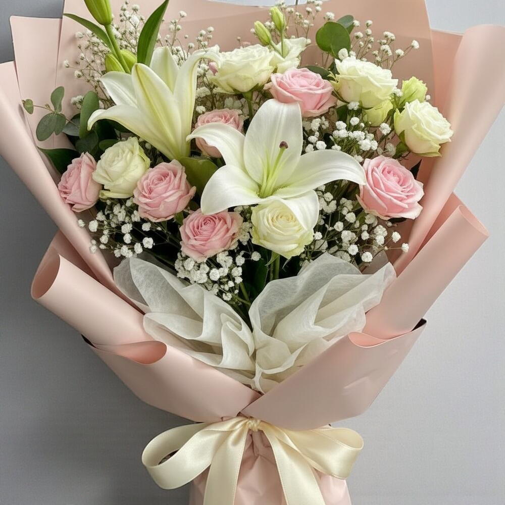 Букет, который шепчет элегантность и романтику: 15 веток свежих белых и розовых роз, сочетающих чистоту и нежность. В сочетании с двумя элегантными белыми лилиями, которые добавляют изысканности и очарования. Эта композиция — идеальный баланс нежности и красоты — идеально подходит для дней рождения, годовщин или просто для того, чтобы сказать «ты особенный». ✨ Закажите сейчас, чтобы удивить любимого человека непреходящей грацией.