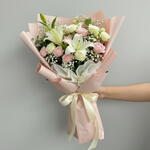 Ribbon - 1 шт. Eucalyptus - 2 шт. Pink rose - 8 шт. White rose - 7 шт. White lilies - 2 шт. Wrapping - 5 шт. гипсофила - 3 шт.