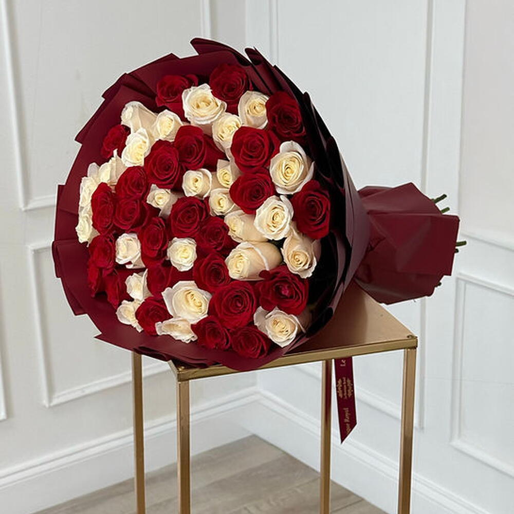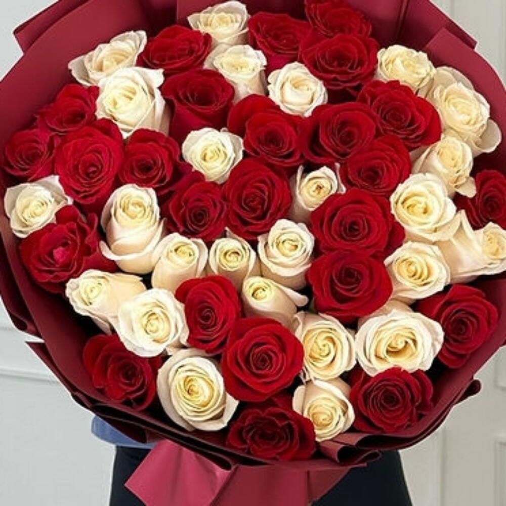 Букет представляет собой яркую смесь тёмно-красных и чисто-белых роз, искусно оформленных и упакованных в сочетающуюся оберточную бумагу с декоративной лентой. Цветы премиум-класса, свежие, обеспечивают длительную красоту. Поводы: Этот крупный, привлекающий внимание букет — идеальный подарок для: Свадеб и годовщин Романтических жестов Дней рождения или просто так Заботливого подарка для любого праздника. И на Женский день.