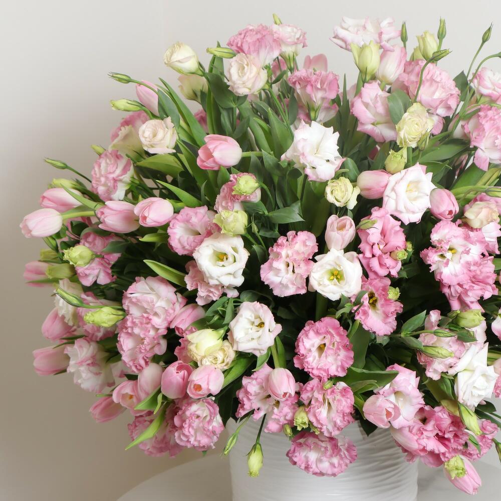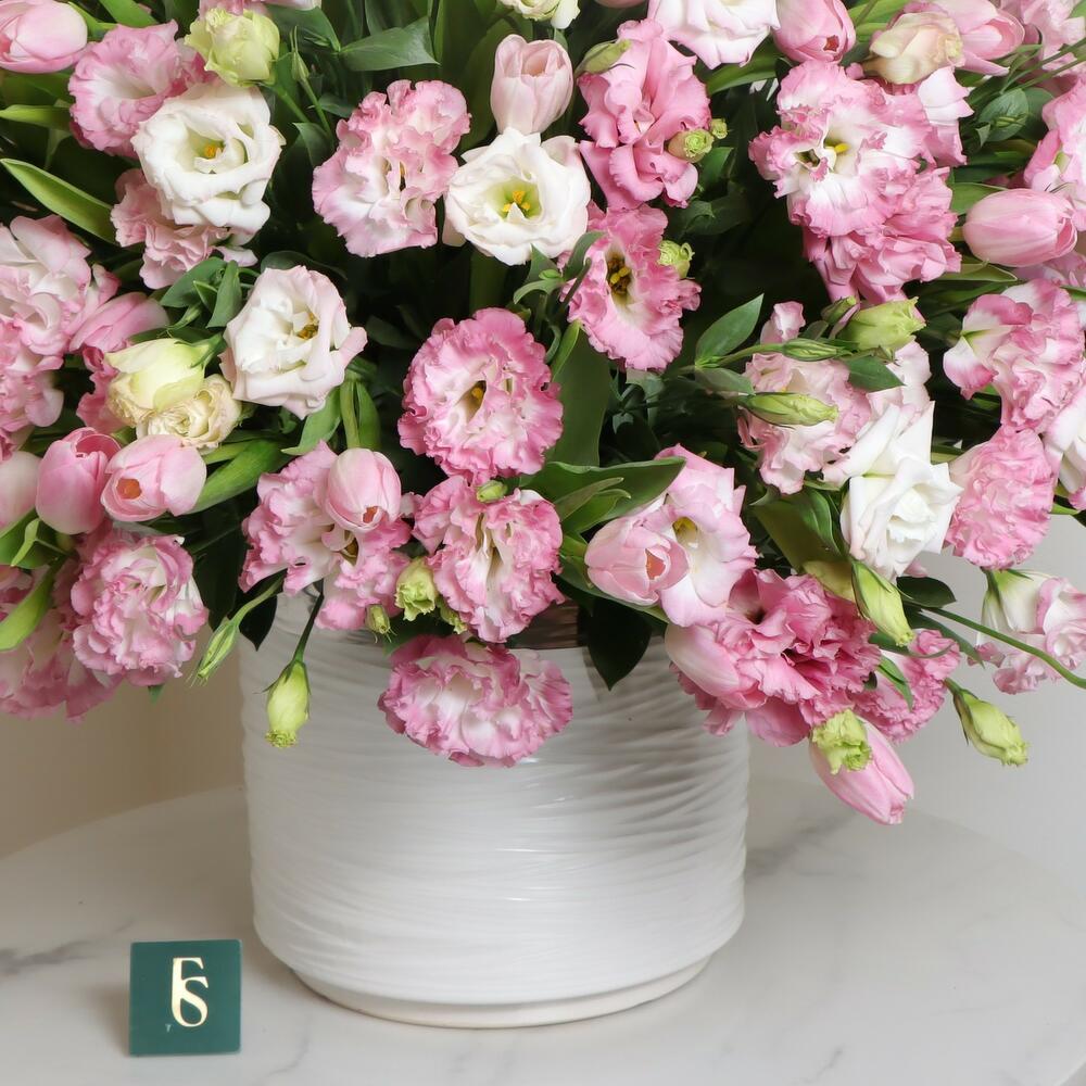 Украсьте свое пространство воздушной красотой нашей композиции из эустомы и тюльпанов в вазе. Нежные цветы эустомы и яркие тюльпаны соединяются в потрясающую композицию, которая привнесет нотку элегантности в любую комнату. Добавьте яркий акцент и нотку утонченности в ваш дом с этой по-настоящему особенной цветочной композицией.