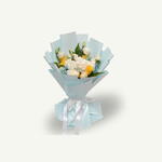 Букет, собранный вручную из 5 белых роз, 5 желтых роз, 5 белых гвоздик, 1 белой гортензии, 3 белых лизиантусов, голубой гипсофилы и папоротника, бережно упакованный в голубую обертку, свежий, жизнерадостный и продуманно сбалансированный.