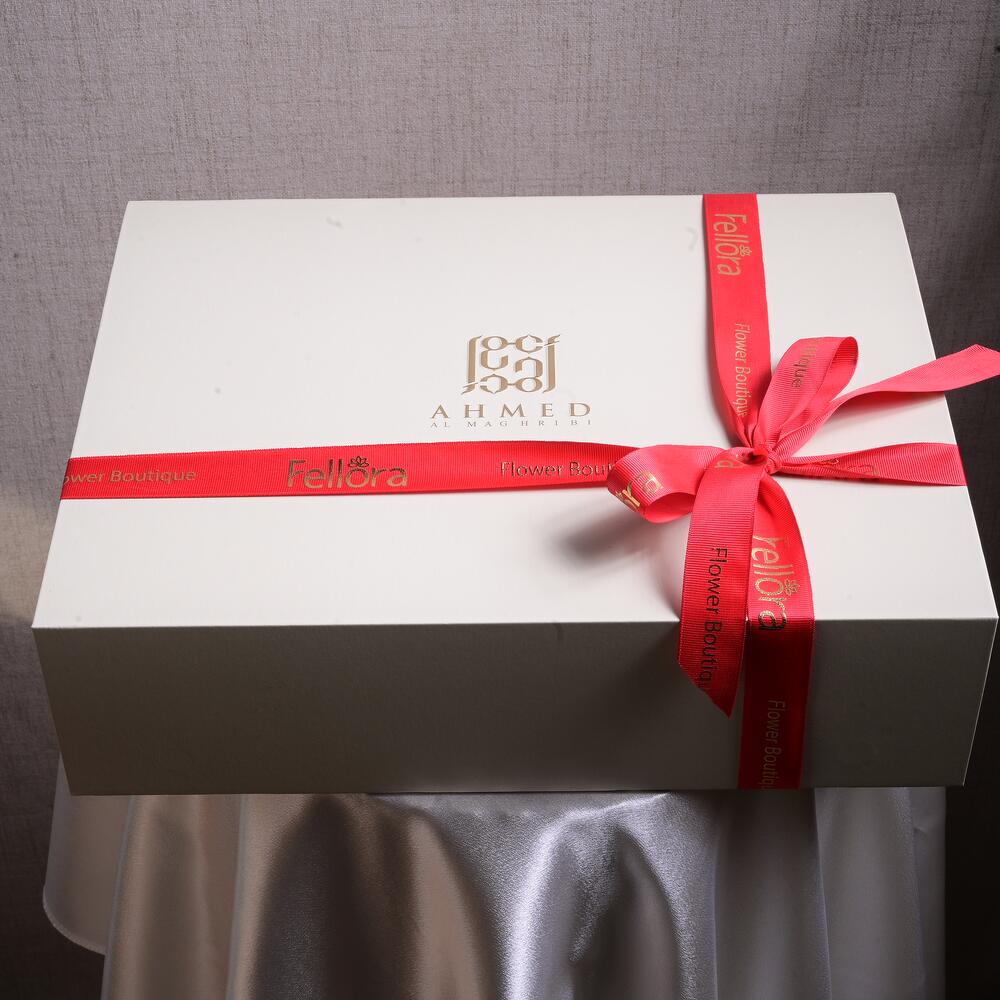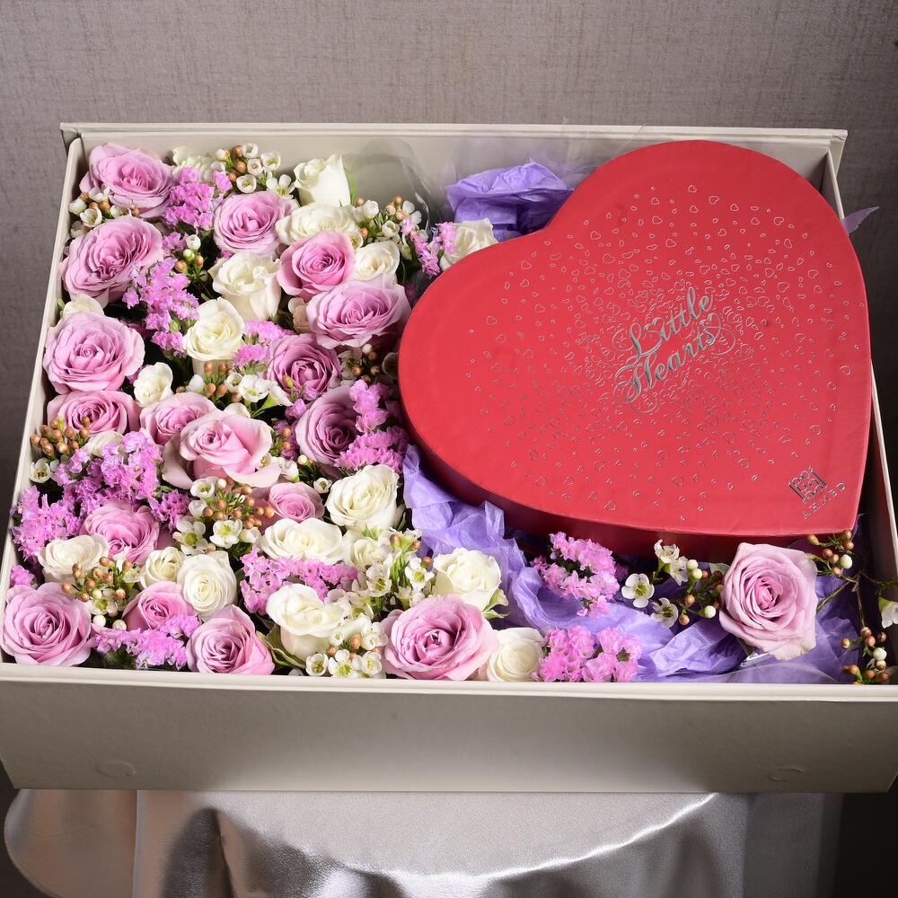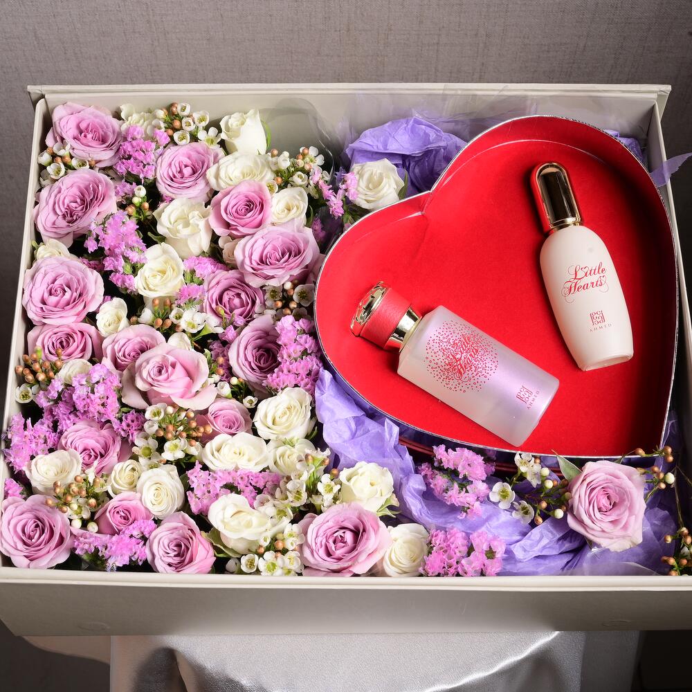 Очаровательное сочетание элегантности и аромата – эта подарочная коробка включает парфюм Little Hearts 50 мл от Ahmed Al Maghribis, в окружении фиолетовых и белых кустовых роз, розовой статицы и восковых цветов. Идеально для дней рождения, годовщин или особых сюрпризов.