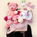 Эта очаровательная композиция представляет собой прекрасное сочетание белых роз, розовых лизиантусов, роз цвета фуксии и нежных кустовых роз сорта «Джульетта». Кустовые розы сорта «Сладкая Сара» и маттиола добавляют лёгкую романтичность, а одиночная орхидея фаленопсис добавляет элегантности и экзотичности. Свежие листья фисташки создают естественный фон, а игривый розовый плюшевый мишка добавляет причудливый и трогательный штрих. Всё это, продуманно упакованное в красивую розовую коробку, идеально подходит для выражения любви, тепла и радости.