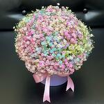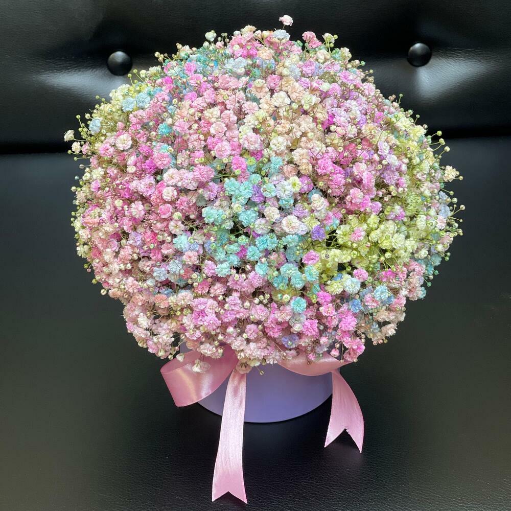 Satin ribbon - 1 шт. floral foam - 1 шт. шляпная коробка - 1 шт. радужная гипсофила (Нидерланды) - 25 шт.