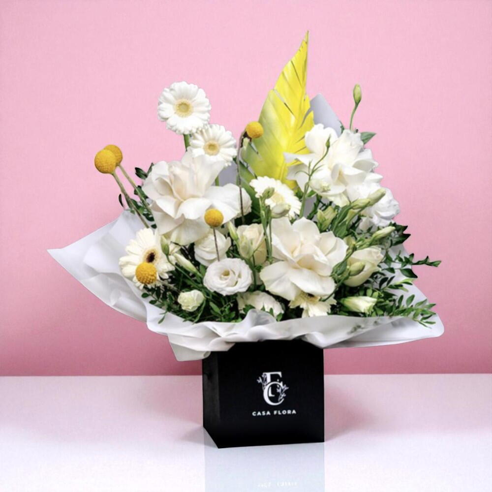 Изысканная цветочная композиция от CASA FLORA, которая сочетает классические и современные элементы. Контраст белых и жёлтых цветов на чёрной квадратной коробке создаёт впечатляющий визуальный эффект, а смесь ромашек, роз и зелени придаёт глубину и текстуру.
