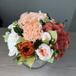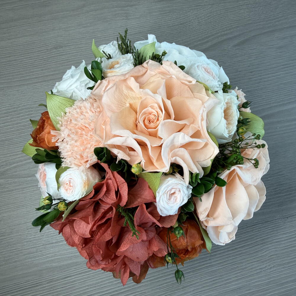 Hydrangea - 1 шт. rose - 4 шт. carnation - 1 шт. garden rose - 9 шт. смесь зелени - 7 шт.