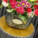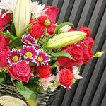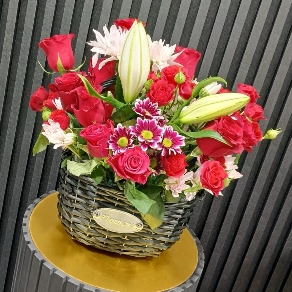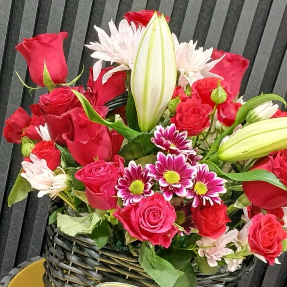 Red rose - 8 шт. Basket - 1 шт. white chrysanthemum - 1 шт. pink chrysanthemum - 1 шт. red baby rose - 6 шт. white lily - 1 шт.