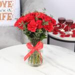Любовь 21 красная роза и гвоздики в вазе