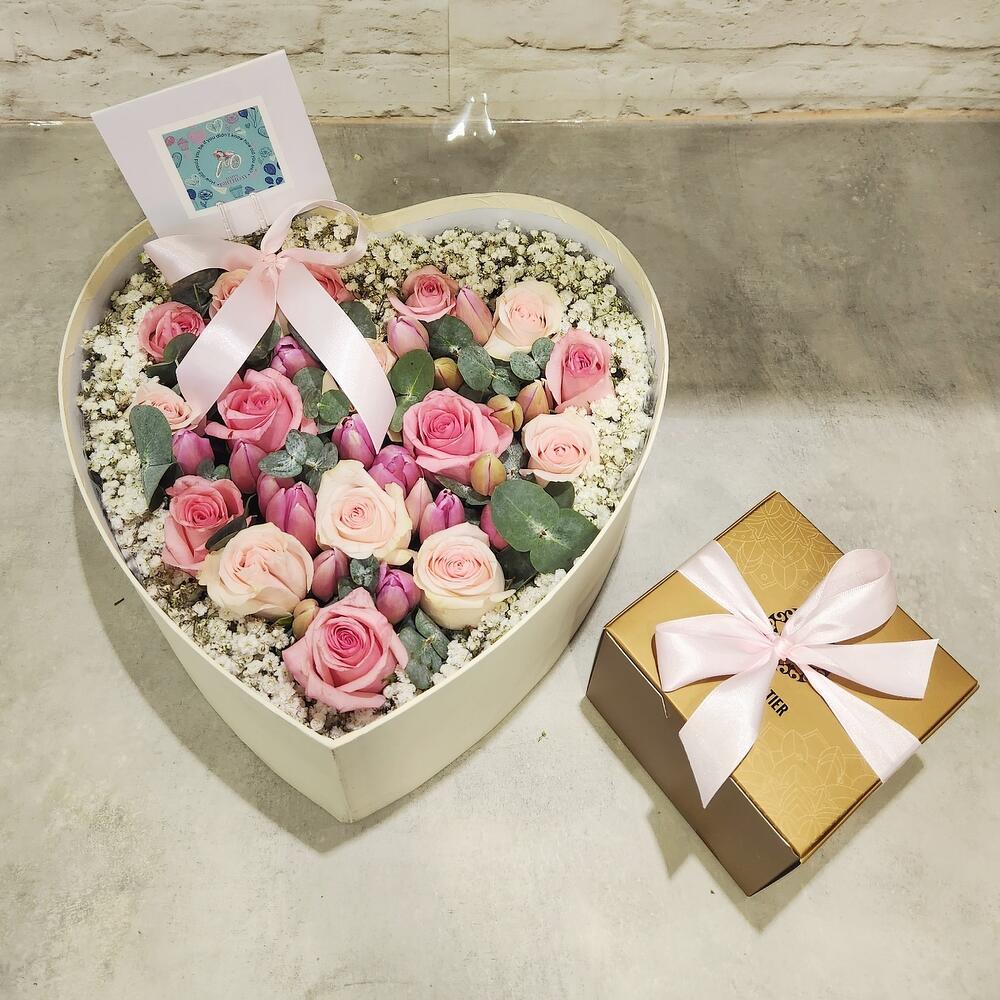розовые тюльпаны и розовая роза с коробкой шоколадных конфет - 1 шт.