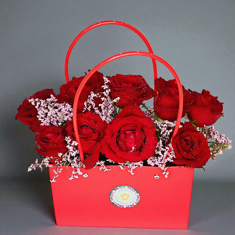 red roses - 10 шт. фиолетовый лимониум спрей наполнитель пар - 3 шт. красная цветочная сумка - 1 шт.