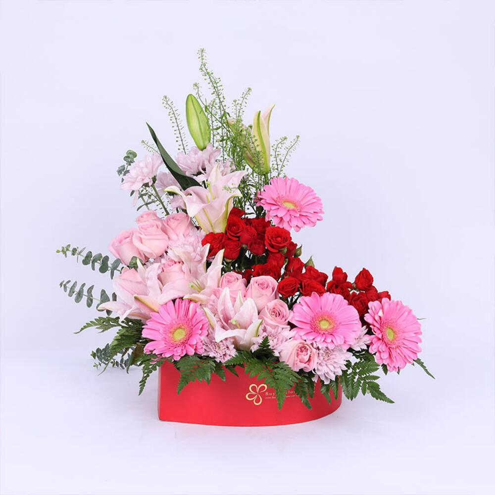 Eucalyptus - 1 шт. pink Gerbera - 4 шт. pink chrysanthemum - 2 шт. красная миниатюрная роза - 4 шт. sweet pink rose - 10 шт. розовые восточные лилии - 2 шт. кожистый папоротник - 3 шт. липидиум - 1 шт. подготовлено в красной коробке в форме сердца, среднего размера - 1 шт.