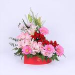 Информация о товаре: 10 нежно-розовых роз 4 розовые герберы 2 стебля розовых восточных лилий 4 стебля красных мини-роз 2 стебля розовой хризантемы Листья: 3 стебля папоротника и 1-2 стебля эвкалипта Наполнитель: 1 стебель липидиума Упаковка в красном боксе в форме сердца (средний размер)