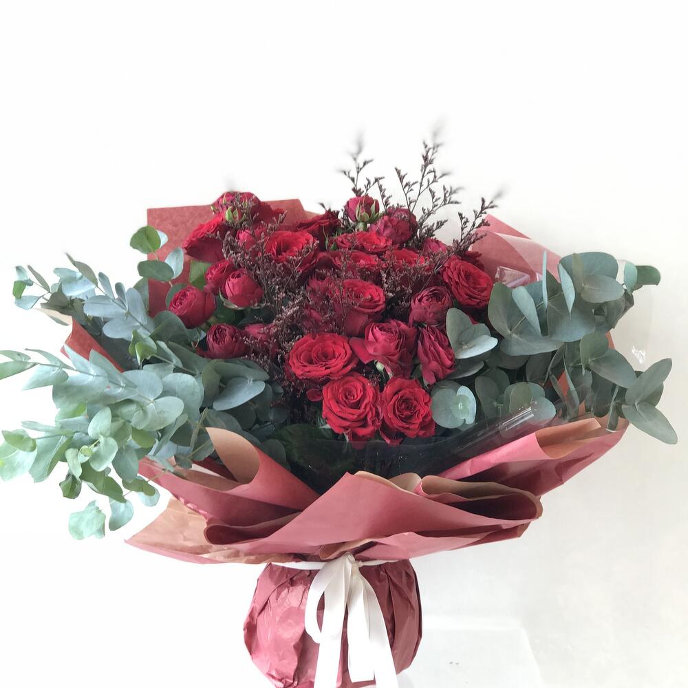 Leaves - 10 шт. красные спрей-розы - 15 шт. ликониум - 3 шт.