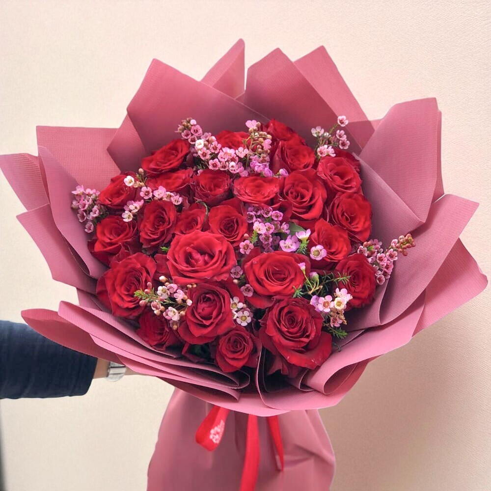 50 роз 6 розовых восков и бесплатная поздравительная открытка.